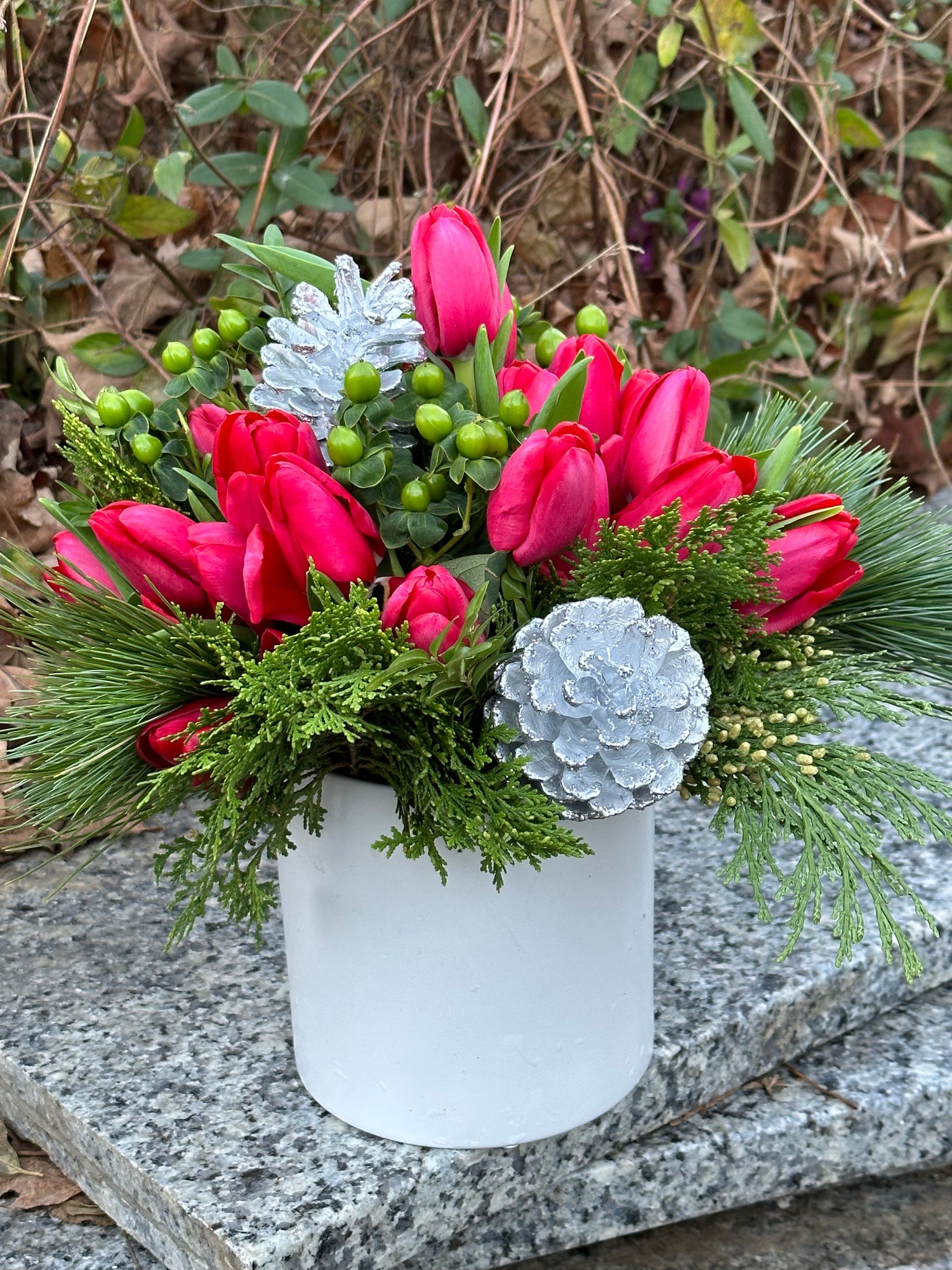 Cut tulips from Holland are a refreshing change to the typical holiday centerpiece. This festive arrangement combines freshly cut tulips in shades of reds, pinks, or whites with berries, seasonal foliage and a few pinecones to add a touch of "holiday cheer"